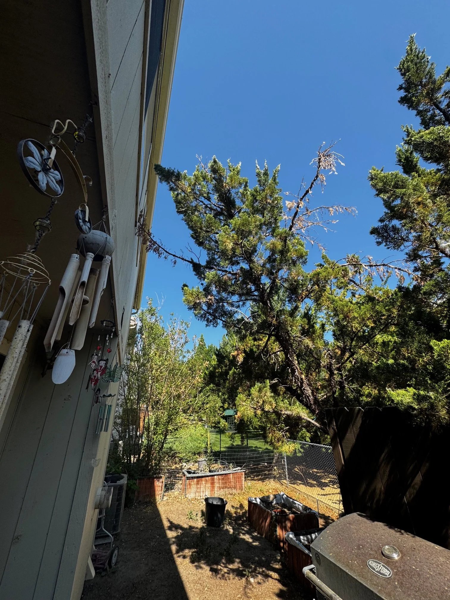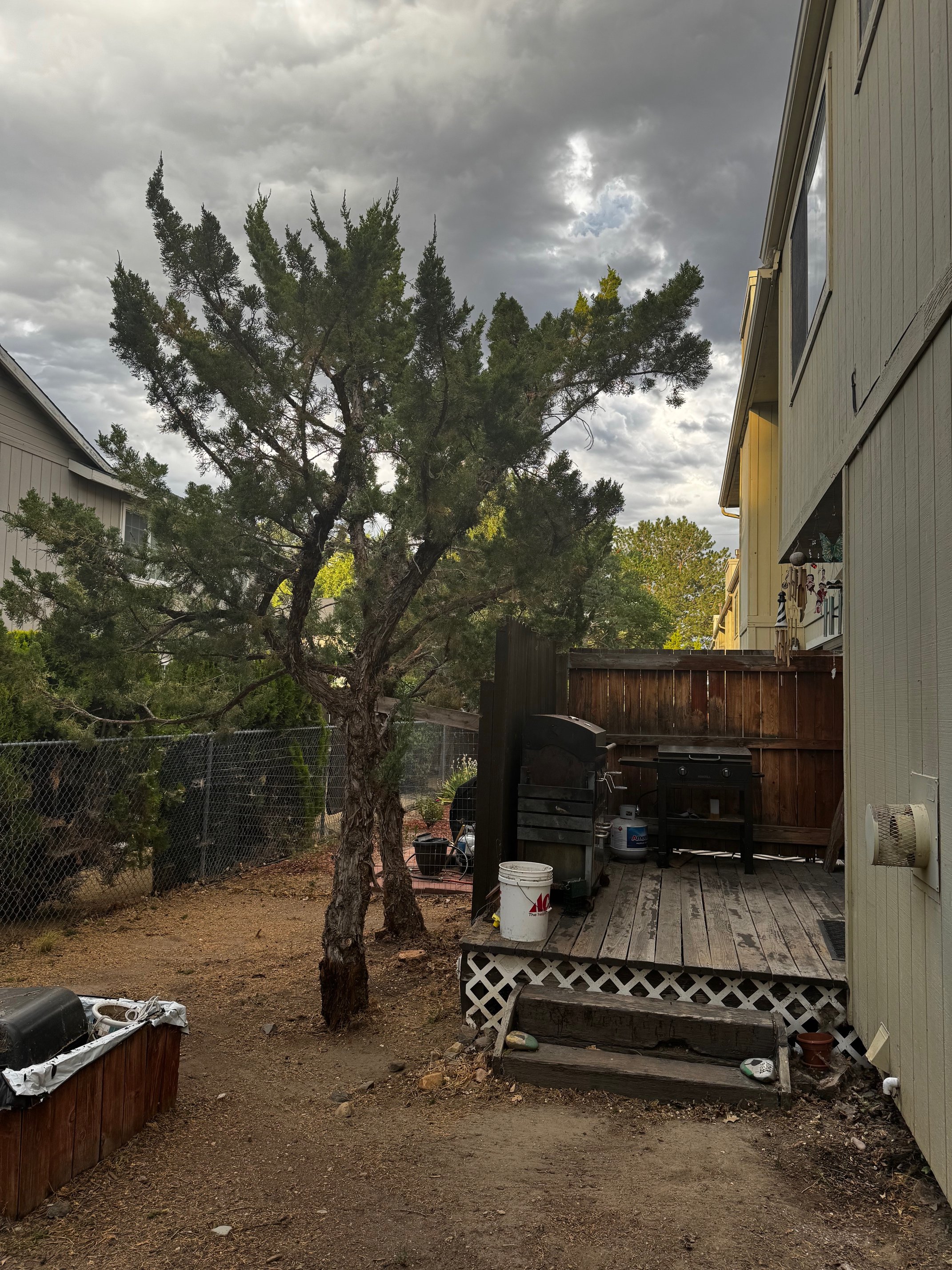 Trees had growth directly into window and building. Trees were pruned to remove contact with structure while still providing shade for back patio area. Smaller tree in between was removed to reduce competition and help improve health of two remaining trees.