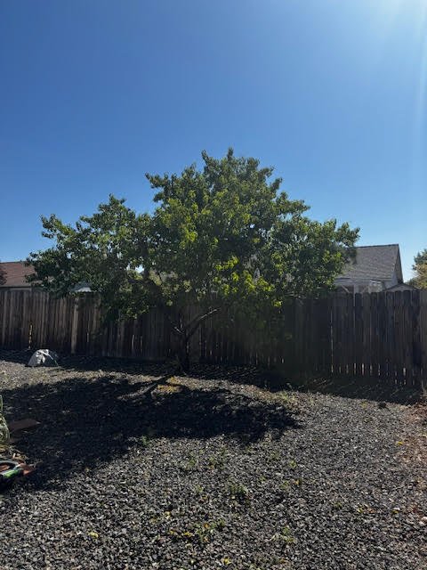Small fruit tree was growing into fence and beginning to obstruct walkway around house. Clearance for fence and access to side yard were achieved while improving overall tree structure.