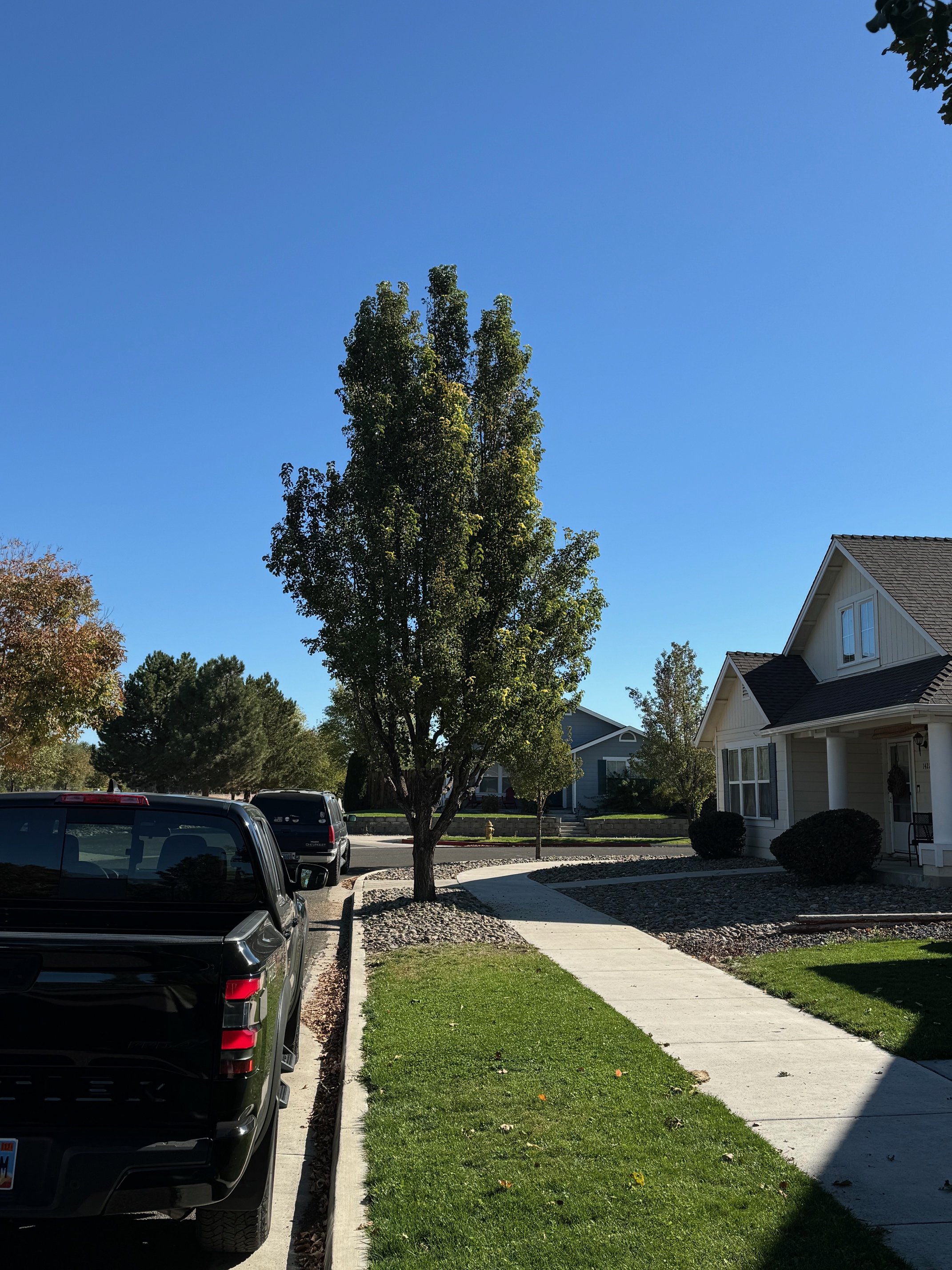 Owner requested road clearance required by HOA. Directional pruning was used to create clearance and help promote future growth away from lower road area. Some concerning branches were also removed to improve architecture and future health.